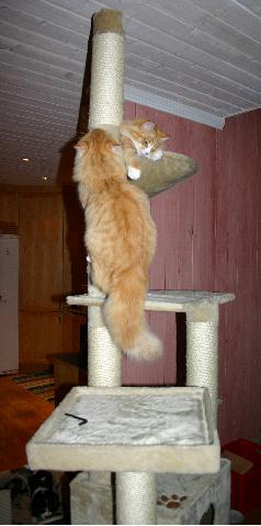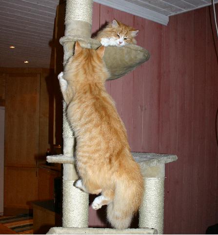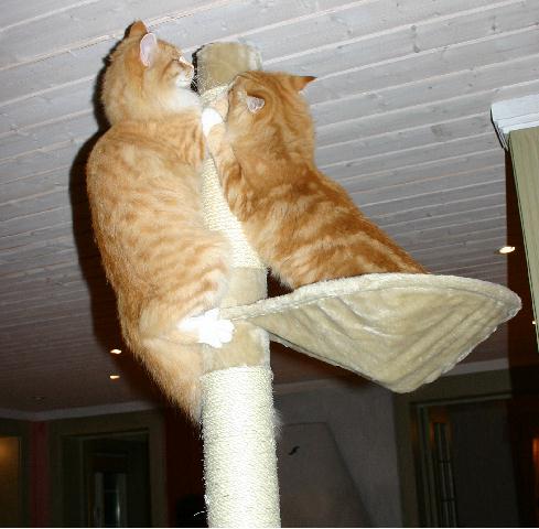 Tyckte det var på tiden att familjen fick ett katträd som någorlunda matchar inredningen. Katterna var självklart med från första stund och hann nog provsitta varje nivå medans trädet växte fram. Lite läckert hur de på en gång verkade veta att det var en ny kattgrej på gång. Vildas favoritplats blev genast den översta hyllan som liksom är som en påse. Där ligger hon gärna o myser med fötterna i vädret. Nisse gillar den lilla kojan i mitten där han kan krypa in...
